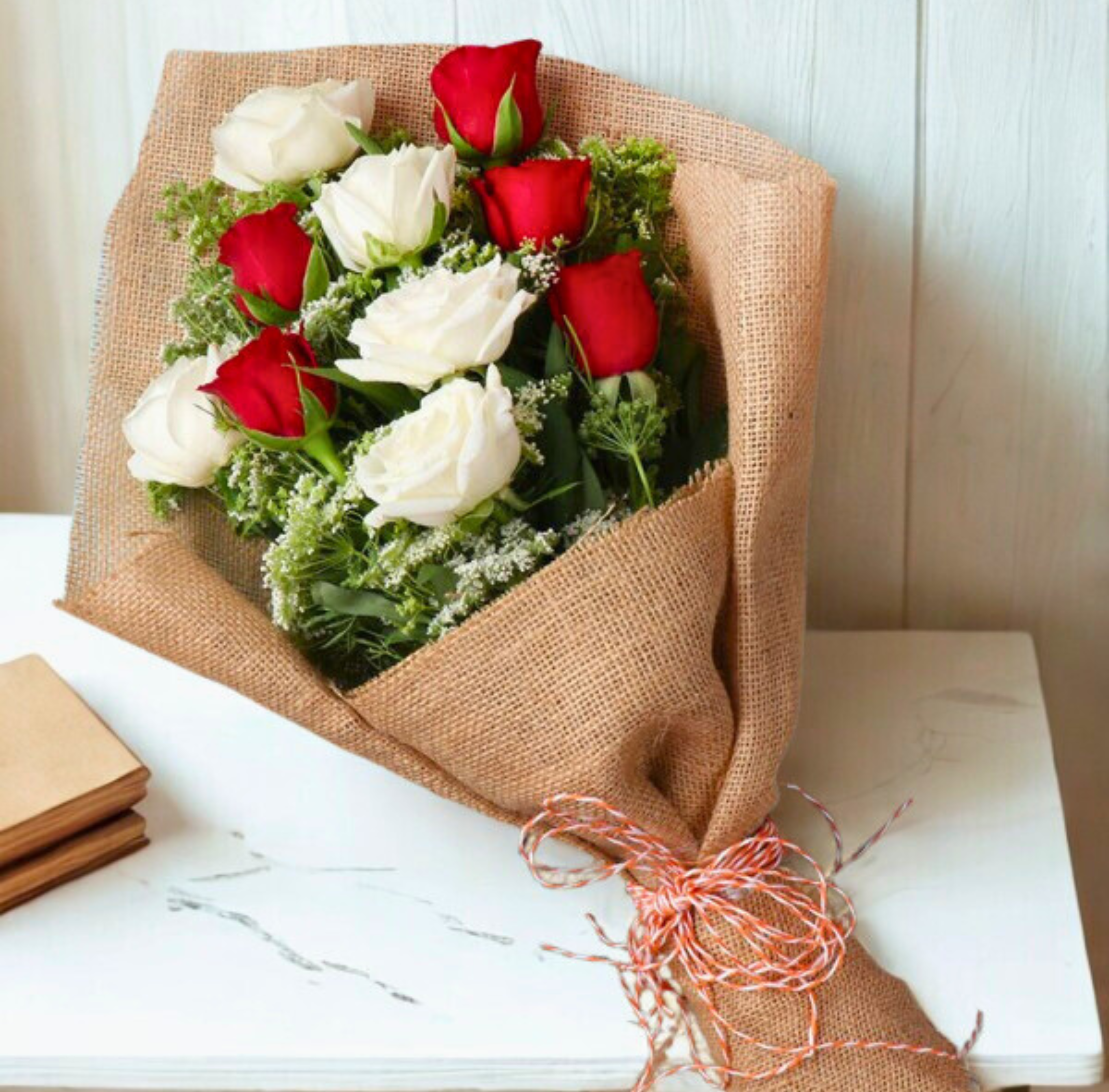 Presenting you these red and white beauties wrapped in rustic jute cloth. This gorgeous rose arrangement is the ideal gift to charm your loved ones on birthdays, anniversaries, or special moments when you want to show how much they mean to you.
