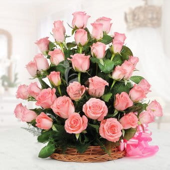 This charming arrangement of 30 pink roses, beautifully displayed in a woven basket, radiates grace and warmth. Each rose is selected for its vibrant hue and delicate petals, creating a bouquet that conveys admiration and love.