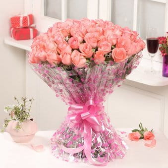 Because of their delicate and delicate color, which represents sweetness and elegance, blushing pink roses provide a lovely means of expressing grace, appreciation, and joy. The 50 light pink roses in this bouquet, together with seasonal fillers, have been thoughtfully chosen to add to its beauty and allure.
