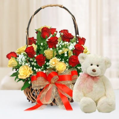 Twelve red and twelve yellow roses, which stand for friendship and love, respectively, are arranged in a pretty basket in the "Caring Delivery" arrangement. A lovable 12-inch teddy bear adds to its attractiveness, making it a considerate and kind gift box appropriate for showing concern and gratitude on a variety of occasions.