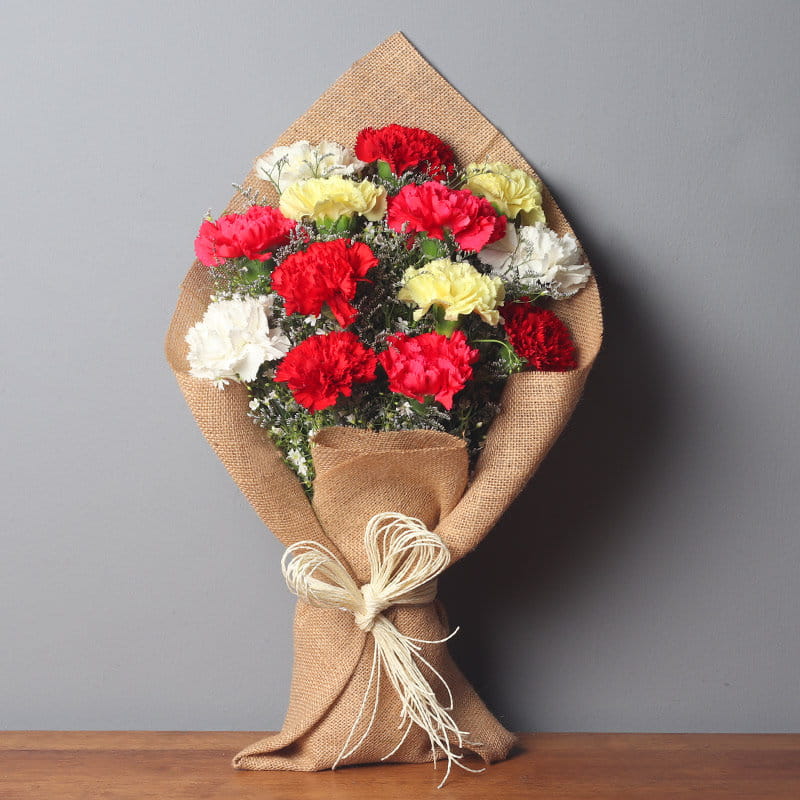 This bouquet combines the beauty and elegance of colorful carnations with the natural appeal of jute and raffia, making it an ideal choice for expressing joyful sentiments or celebrating special moments.