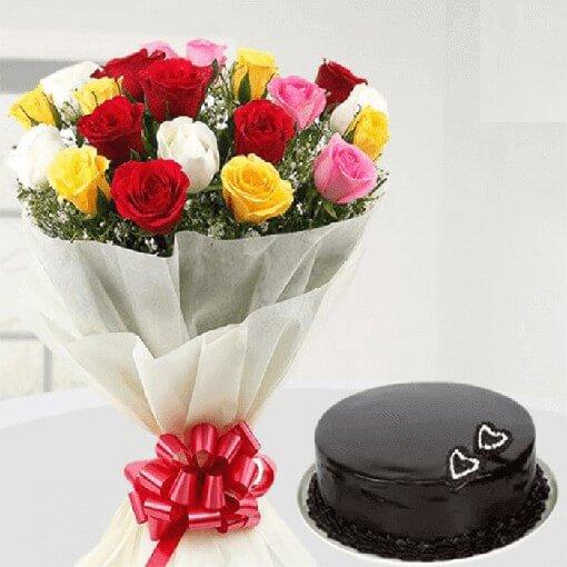 This combo combines the beauty of colorful roses with the deliciousness of a chocolate truffle cake, making it an ideal choice for celebrating special occasions or expressing love.