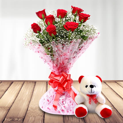 This adorable gift, which includes a cute 6-inch teddy bear and eight red roses, will make you feel a lot of different feelings. This arrangement of roses and a teddy bear is ideal for conveying love, affection, or sincere feelings. It makes a heartwarming and joyful present for any occasion.