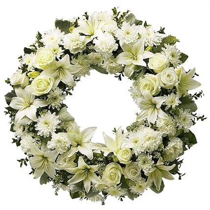 Celebrate elegance with our beautiful "Flower Wreath," thoughtfully designed using a selection of fresh flowers. This stunning arrangement includes 10 white lilies, 15 white carnations, 20 white chrysanthemums, and 15 white roses, offering a perfect balance of textures and colors.