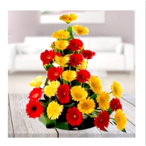 Immerse yourself in the vibrant beauty of our “Gerbera Blossom” arrangement, featuring 15 red gerberas, 15 yellow gerberas, and seasonal green fillers. Expertly arranged in a charming woven cane basket, this lively bouquet adds a splash of color and cheer to any space or occasion. Perfect for expressing joy, gratitude, or simply brightening someone's day with its fresh and energetic appeal.