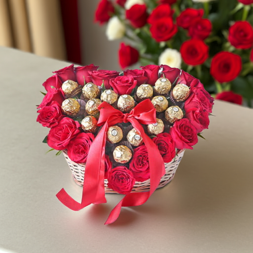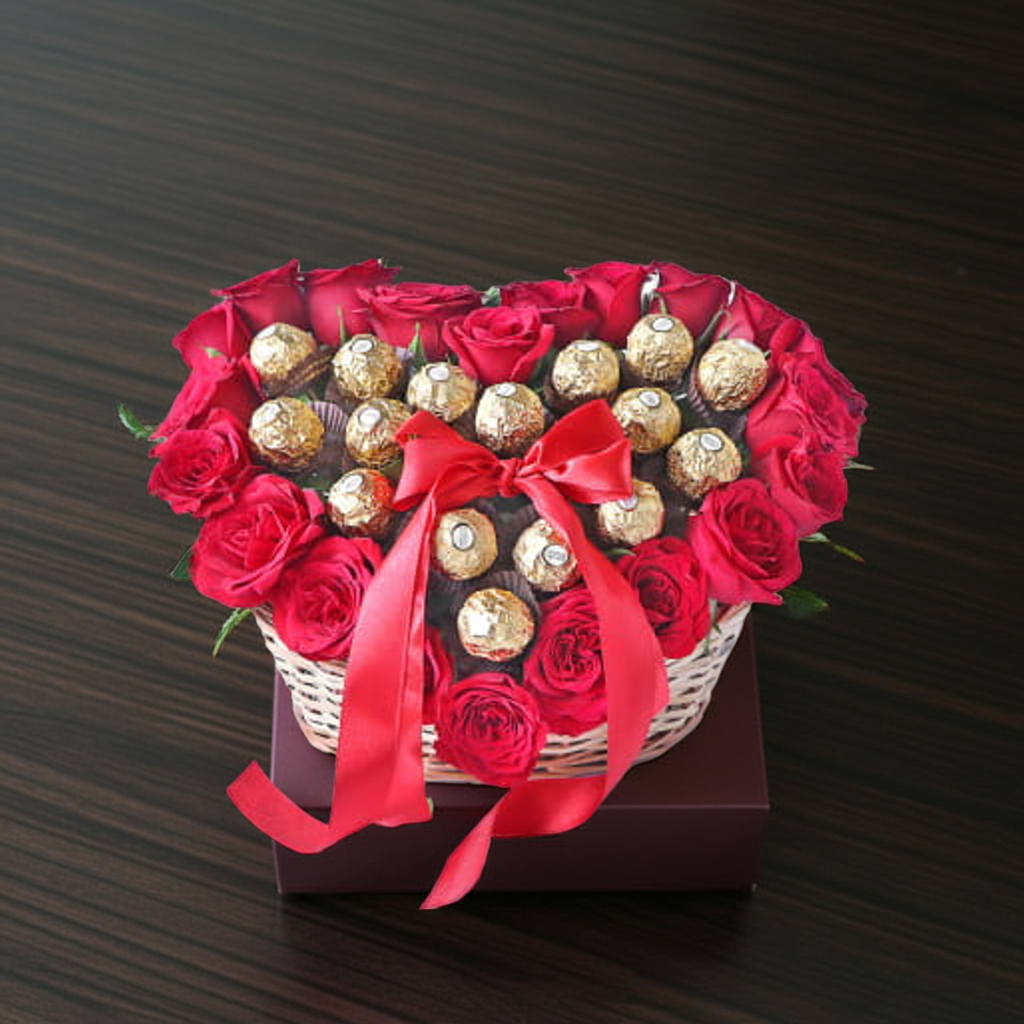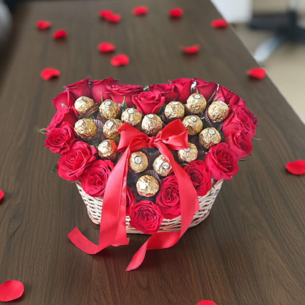 Give your loved ones a surprise with our "Heart-Shaped Combo Display," which includes 16 delicious Ferrero Rocher chocolates and 24 gorgeous red flowers. This gorgeous arrangement, which combines the timeless beauty of roses with the irresistible charm of fine chocolates, is beautifully placed in a heart-shaped basket. This arrangement conveys love and affection in the most exquisite and charming way, making it ideal for romantic gestures, anniversaries, or any special event.