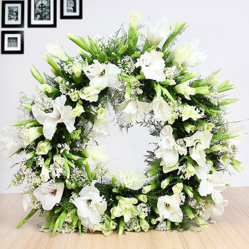 The soothing tones and elegant design of this wreath offer a gentle reminder of the love and admiration shared for the departed, making it an ideal choice for memorial services, funerals, or any moment of remembrance. Each gladiolus bloom is carefully placed to reflect the serenity and dignity of the occasion, offering a visual message of comfort and peace during times of sorrow.
