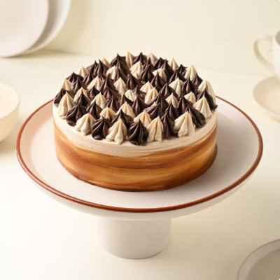 Indulge in the Exquisite Coffee Delight Cream Cake, a true masterpiece for those who appreciate the finer things in life. Each layer of this sumptuous cake is infused with a rich, aromatic coffee flavor that fills your senses with warmth and bliss. The velvety-smooth coffee cream frosting creates a stunning ombre effect, elegantly cascading over the edges of the cake. Intricately piped rosettes of coffee and chocolate cream add a luxurious touch to the design, promising a truly indulgent experience. Perfect for any occasion, this cake is a testament to the art of dessert-making, blending sophistication and flavor in every bite.