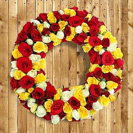 Mixed Color Roses Wreath is a stunning creation of 50 red roses, 25 white roses, and 25 yellow roses, symbolizing love, purity, and friendship.