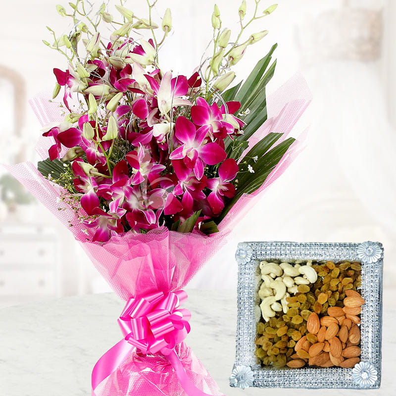 This delicious present comes with a big 1 kg mix of high-quality dried fruits and a bouquet of six orchids, all beautifully wrapped in cellophane and tied with a pink ribbon. Bright blooms and wholesome dry fruits come together to provide a classy and opulent gift for any occasion.
