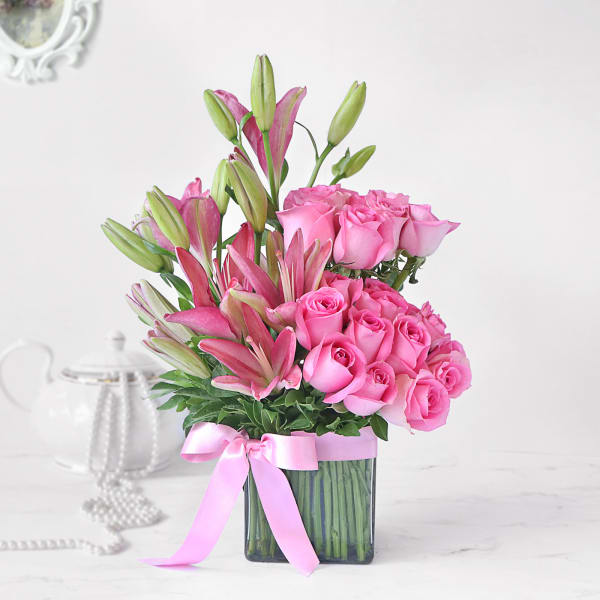 In addition to three pink Asiatic lilies and twenty pink roses, this exquisite arrangement also includes dracaena foliage and green fillers. This bouquet, which comes in a 4 x 4-inch glass vase with vase fillers, is the ideal way to give a touch of sophistication to any occasion because it radiates a sophisticated charm.