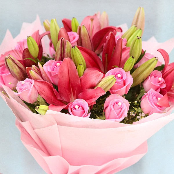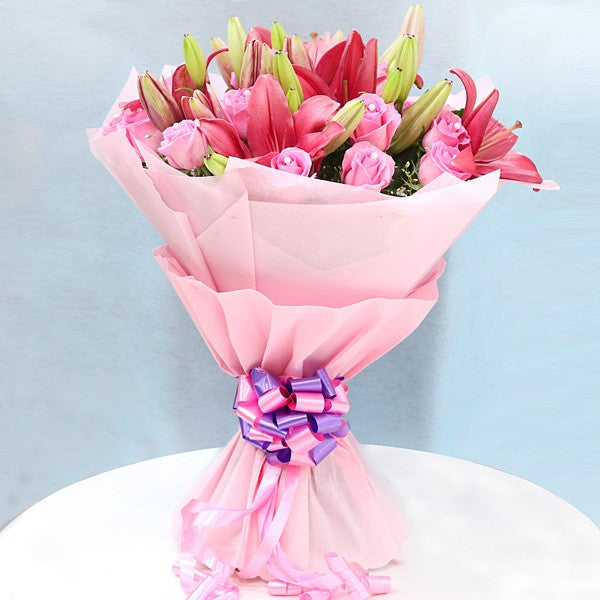 Surprise your loved one with the elegance of 20 Pink Roses and 5 Pink Asiatic Lilies, beautifully arranged in a stunning bouquet. Perfect for birthdays, anniversaries, or romantic gestures, this charming floral arrangement is a symbol of love, grace, and admiration.
