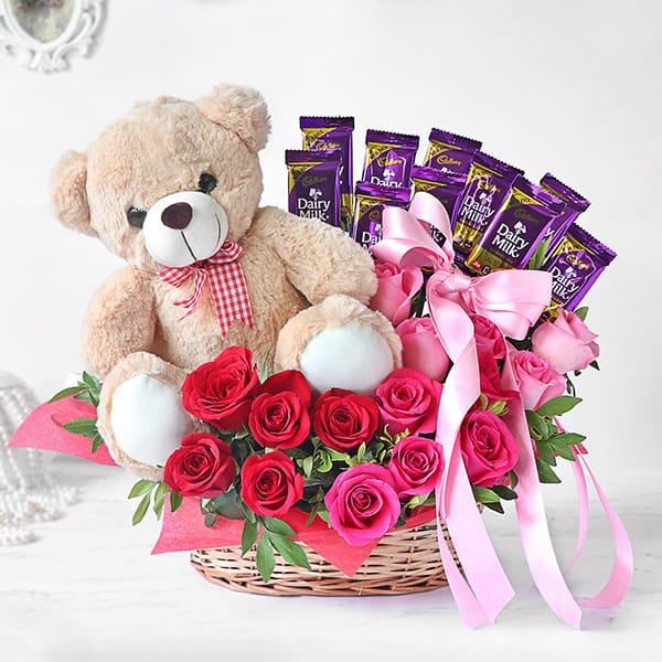 Ten pieces of Dairy Milk chocolates (12.5 grams each) are included with 15 exquisitely arranged red and pink flowers in the "Red and Pink Roses with Chocolates and Teddy Bear" package. This adorable present is ideal for expressing warm feelings because it comes with a 6-inch teddy bear, seasonal fillers, and a pretty cane basket.