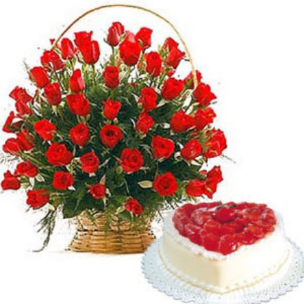 The "Heart-Shaped Cake and Red Roses Basket" is a delightful combo, perfect for expressing love.