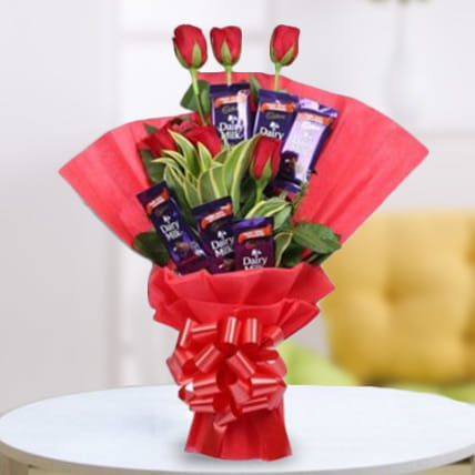 This lovely gift set includes six Cadbury Dairy Milk chocolates, each weighing 12.5 grams, and a lovely arrangement of six red flowers. Seasonal foliage complements the roses and chocolates, which are tastefully wrapped in red paper and tied with a red ribbon. This exquisite arrangement is ideal for any occasion since it blends the elegance of fresh flowers with the decadence of fine chocolates.