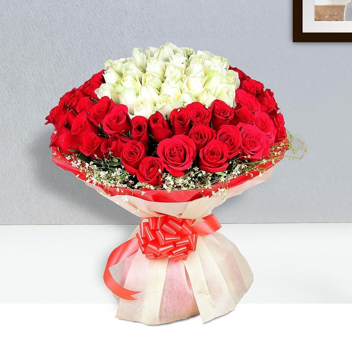 The Red N White Roses Bouquet features a stunning combination of 75 vibrant red and pristine white roses, symbolizing love and purity. Complemented by lush green fillers, this bouquet is a perfect blend of elegance and charm. Wrapped in red and pink paper and tied with a matching ribbon, the presentation exudes sophistication and grace. Ideal for any special occasion, such as anniversaries, romantic gestures, or celebrations, this bouquet makes a memorable and heartfelt gift, adding a touch of beauty and elegance to any moment.