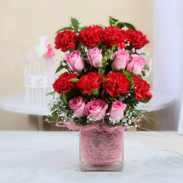 The Rose & Carnation in Glass Vase blends style and lively appeal. This arrangement consists of: