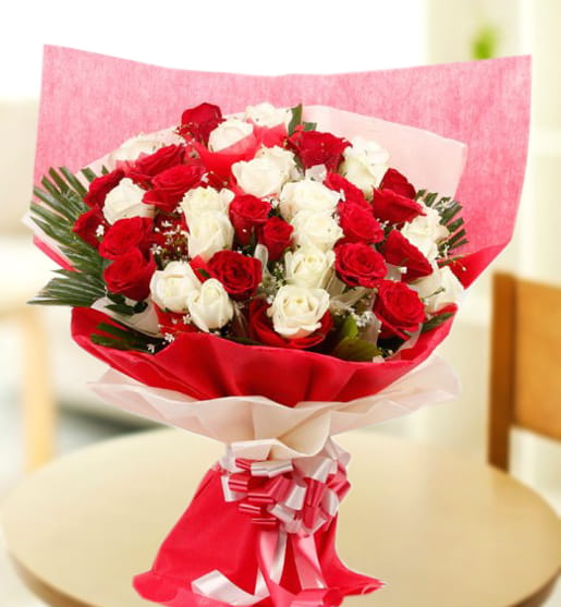 A stunning arrangement that skillfully combines traditional romance with elegant beauty is the "Rosy Elegance Bouquet." Twenty crimson and twenty white roses, which stand for both intense love and unadulterated adoration, are included in this exquisite arrangement. Seasonal green fillers are used to embellish the bouquet, giving it a lively and new look. This arrangement, which is wrapped in a sophisticated red and white paper and laced with a ribbon of mixed colors, is ideal for expressing your feelings on any special occasion. This bouquet is a timeless declaration of love and appreciation because of the creative arrangement and the combination of red and white roses.