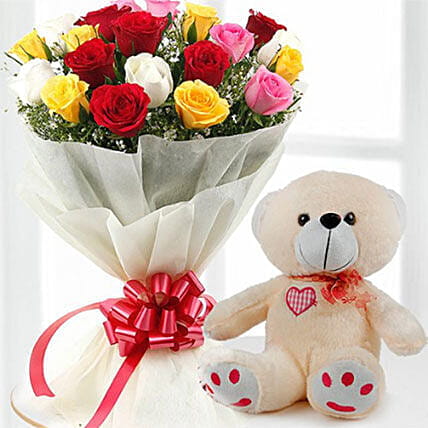 This elegant and endearing present is perfect for expressing love, gratitude, or congrats on important occasions like birthdays, anniversaries, or romantic gestures. This combination is a memorable and considerate way to convey deep feelings since the roses' range of hues adds a personal touch and the stuffed teddy bear heightens the emotional appeal.